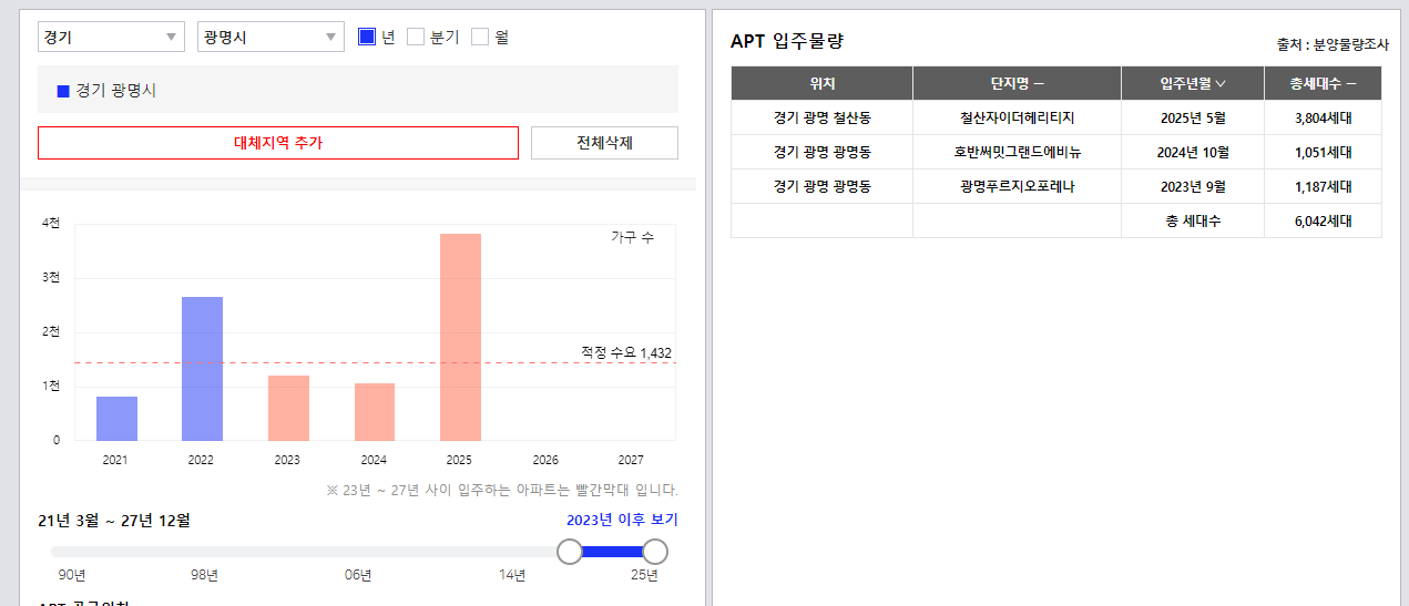 다만 그 효과가 어느 정도일지는 미지수이긴 합니다. 당장 광명뿐만 아니라 강남구 입주물량도 23~24년에 적정수요를 2~3배 초과한 물량이 대기중입니다.